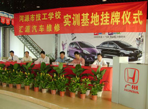 10月26日上午,河源市技工學(xué)校匯源汽車銷售公司實(shí)訓(xùn)基地掛牌儀式在匯源汽車銷售公司舉行。河源市技工學(xué)校100多名師生、匯源汽車銷售公司部分員工參加了掛牌儀式。市委常委、市政府副市長(zhǎng)楊耀初同志,市政府邱榮輝副秘書長(zhǎng),及市勞動(dòng)保障局等部門領(lǐng)導(dǎo)出席了掛牌儀式。掛牌儀式由市勞動(dòng)保障局歐繼勝副局長(zhǎng)主持,匯源集團(tuán)賴運(yùn)宏董事長(zhǎng)在掛牌儀式上致詞,市技工學(xué)校歐陽(yáng)仕文校長(zhǎng)發(fā)表講話。最后,楊耀初副市長(zhǎng)作了重要講話。楊副市長(zhǎng)充分肯定了匯源汽車銷售公司與市技工學(xué)校的合作,高度贊揚(yáng)了匯源汽車銷售公司勇?lián)鐣?huì)責(zé)任、充滿愛心的企業(yè)精神;希望校企繼續(xù)努力,更快、更好地為社會(huì)培養(yǎng)更多、更優(yōu)的有用人才!