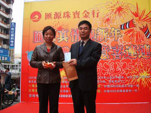 2007年2月28日,“匯源真情迎新年,濃情厚意喜連連”公開抽獎(jiǎng)活動(dòng)在金行中山店門口舉行,由市凌晨演出公司策劃,市公證處李文勇、游小健公證員現(xiàn)場(chǎng)公證,公開抽出一等獎(jiǎng)2名,二等獎(jiǎng)3名,三等獎(jiǎng)10名,四等獎(jiǎng)30名。