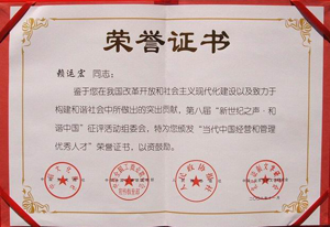 2008年11月29日,由中國文化報(bào)社、中華全國工商聯(lián)宣教部、人民政協(xié)報(bào)社、中國.北京法制文學(xué)研究會(huì)共同主辦的第八屆“新世紀(jì)之聲.和諧中國”評(píng)選表彰大會(huì)在北京人民大會(huì)堂隆重舉行。匯源集團(tuán)賴運(yùn)宏董事長(zhǎng)榮獲“當(dāng)代中國經(jīng)營(yíng)和管理優(yōu)秀人才”光榮稱號(hào)。此項(xiàng)評(píng)選活動(dòng)自2008年5月份開始在全國范圍內(nèi)開展,歷時(shí)5個(gè)月,評(píng)選出一批在我國改革開放和社會(huì)主義現(xiàn)代化建設(shè)以及致力于構(gòu)建和諧社會(huì)中做出突出貢獻(xiàn)的人士。