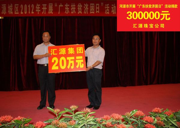2012年6月30日,在“廣東省扶貧濟(jì)困日”活動中,匯源集團(tuán)捐款20萬元,匯源珠寶捐款30萬元。